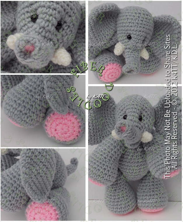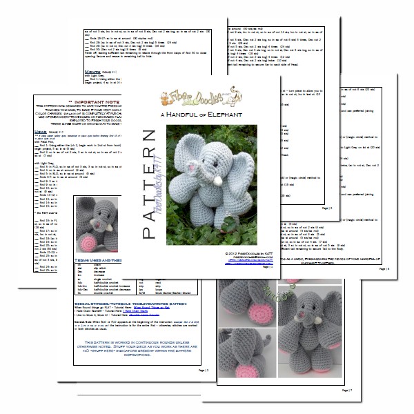 A Handful of Elephant contains 8 pages of pattern instructions, with detail oriented photographs and instructions to help you bring this happy, 9 inch little friend together.  (and Yes, the Trunk/Head is all one piece)