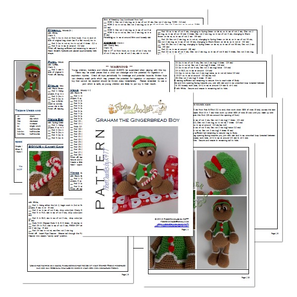 Graham, the Gingerbread Boy contains 11 pages of pattern instructions, with detail oriented photographs and instructions to help you bring this deliciously sweet, 17 inch plush friend together to share with your little one or just have around for the holidays.