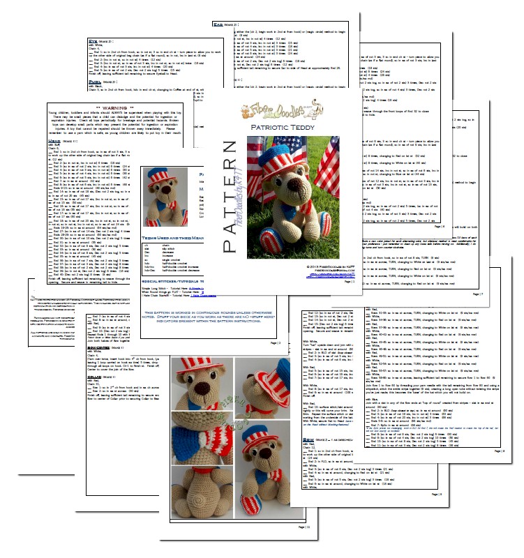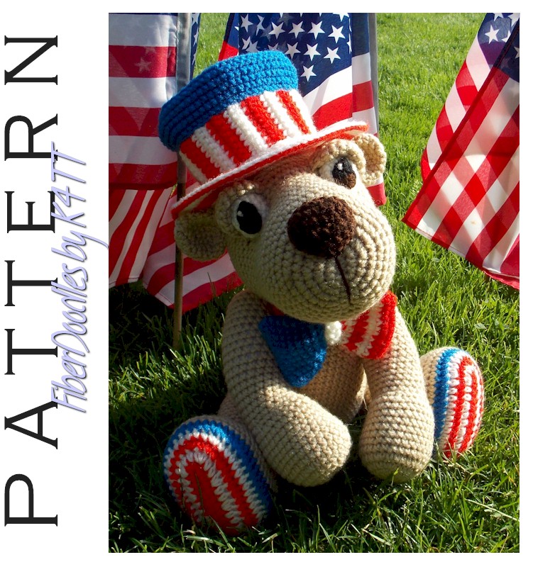 The Yankee Doodle Teddy pattern contains 12 pages of pattern instructions, with detail oriented photographs to help you bring this 18.5 inch friend to life (15.5 in tall without hat).