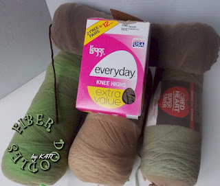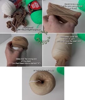 Knee High Pantyhose work GREAT to keep your yarn clean while you are working on a project AND if you need to wash it for any reason... like say your 200lb beastie accidentally spills a half full cup of coffee on your almost brand new skein of White Red Heart Super Saver just because the mailman has the audacity to knock at the door so you can sign for a package... I mean, not that has ever happened; but merely as an example *grin*